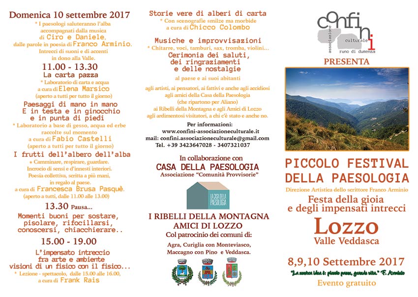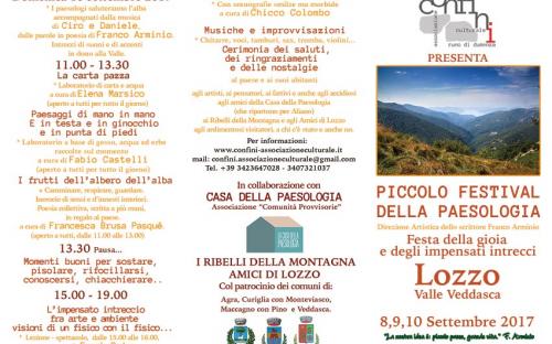 Nella frazione di Lozzo (Val Veddasca),sopra Luino, a partire dal tardo pomeriggio di venerdì 8 settembre fino alle 19.00 di domenica 10 settembre, tre giorni di festa in omaggio della gioia e degli impensati intrecci.