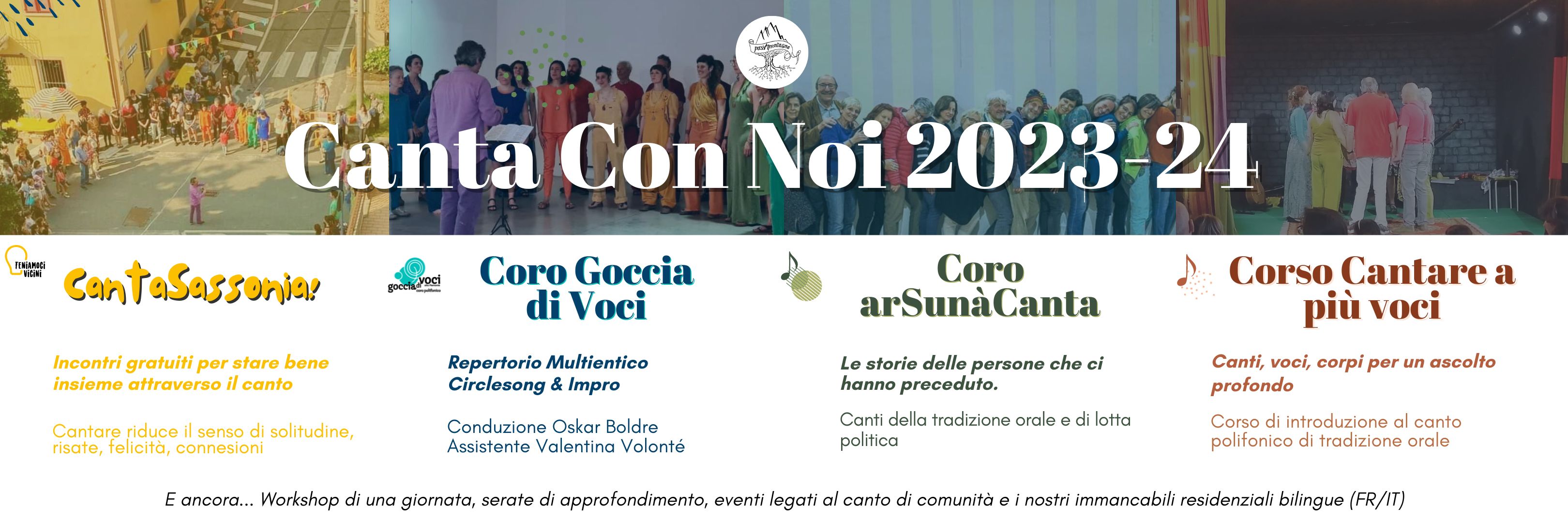 Continua a seguirci per scoprire i dettagli di tutte le nostre iniziative e non perderti i nostri workshop di una giornata, serate di approfondimento ed eventi legati al canto di comunità. Ci saranno anche i nostri immancabili seminari residenziali (FR/IT) di più giorni! In Italia, in Francia e in Svizzera!