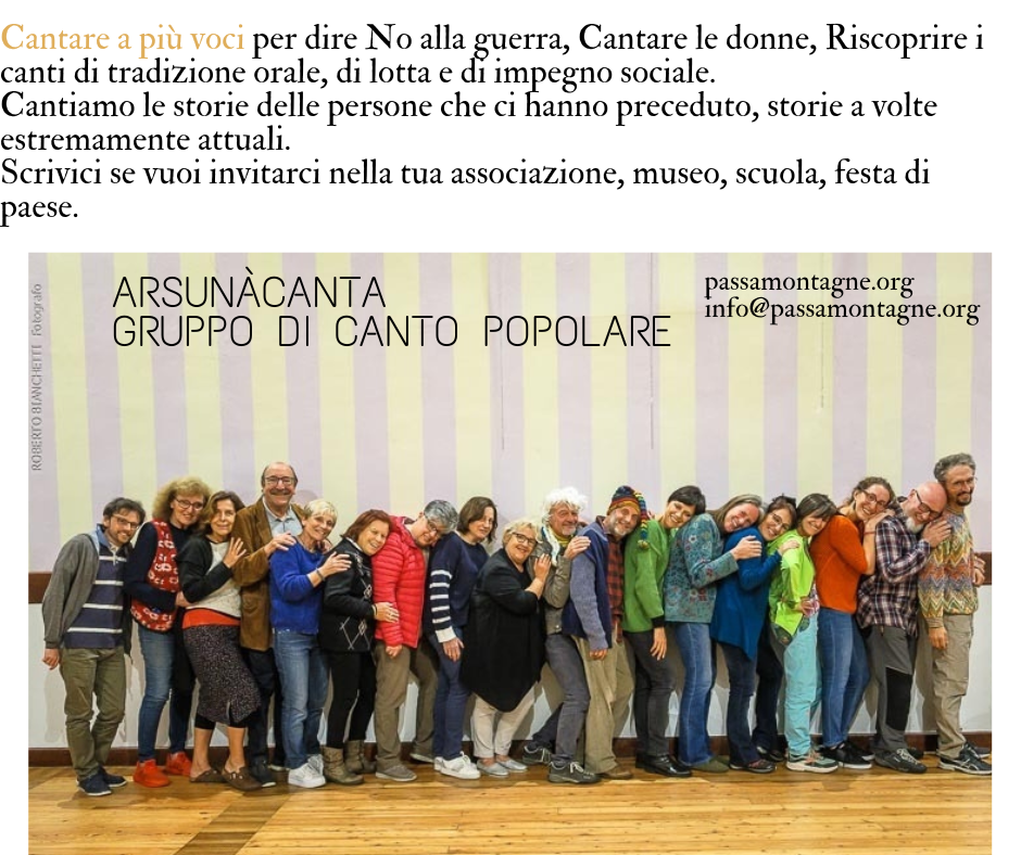 CANTARDONNA Concerto-Spettacolo. Un collage di parole e canti per raccontare le battaglie che in diverse parti del mondo artiste donne - cantanti, musiciste, ricercatrici, studiose - hanno combattuto contro ogni forma di violenza. Tutte la stessa missione: preservare e diffondere la cultura orale del proprio territorio. Violetta Parra, Joan Baez, Giovanna Marini, Giovanna Daffini, Rosa Balistreri, Caterina Bueno, Sandra Mantovani.... Ci raccontano le battaglie contro ogni forma di violenza, portando in primo piano tematiche ancora di grande attualità. Attraverso i canti del gruppo di canto popolare ArSunàCanta, le letture di Stefania Zanetta e la musica di Massimo Losito, lo spettacolo restituisce una narrazione delle vite private e artistiche delle donne citate. Lo spettacolo è liberamente ispirato al libro di Chiara Ferrari "Le donne del folk. Cantare gli ultimi" ed. Interno4 2022.