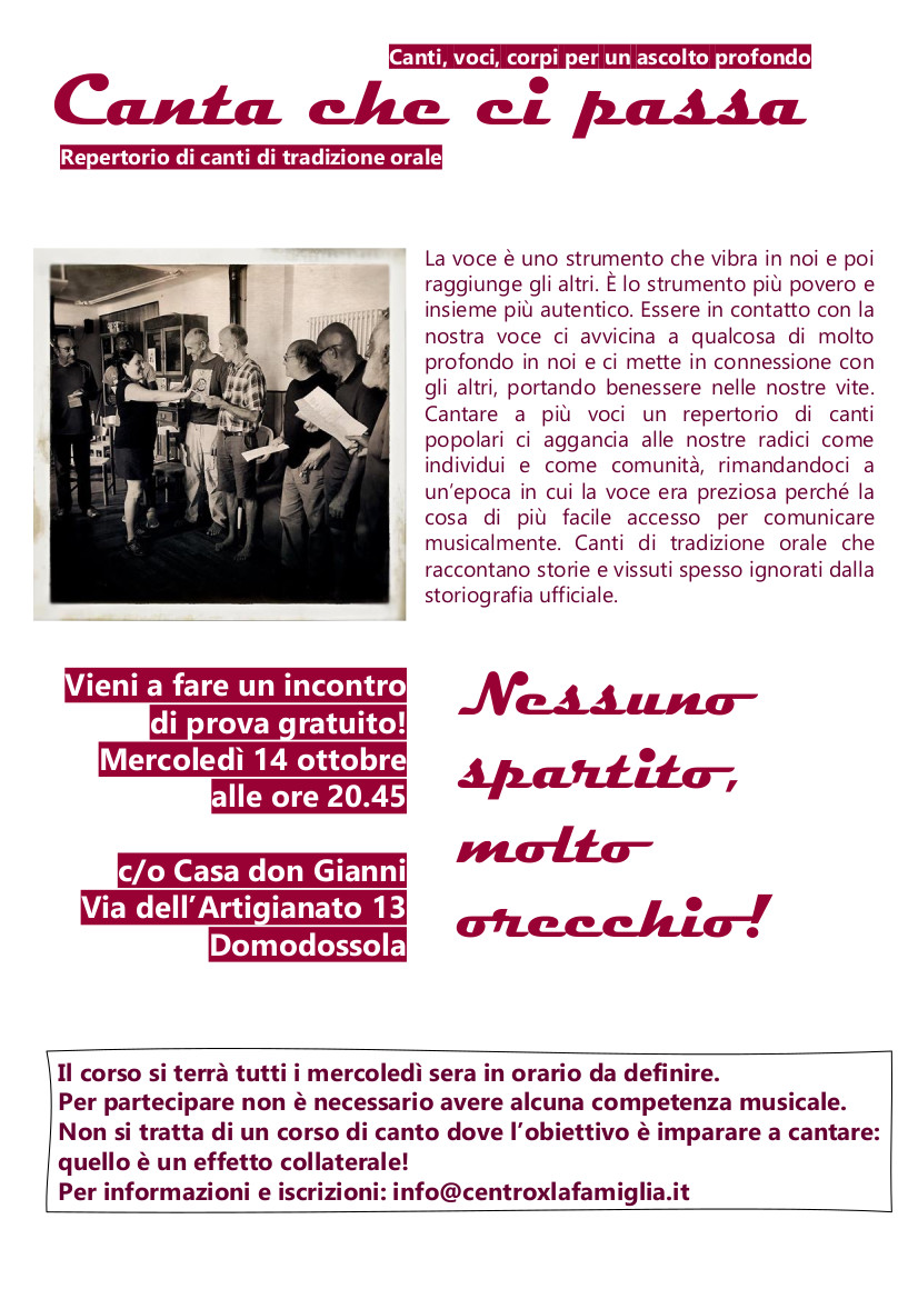 Mercoledì dalle 20.45 alle 22.15 con il Centro per la famiglia, coop. La Bitta c/o Casa Don Gianni Domodossola. Canta che ci passa, canti, voci, corpi per un ascolto profondo.