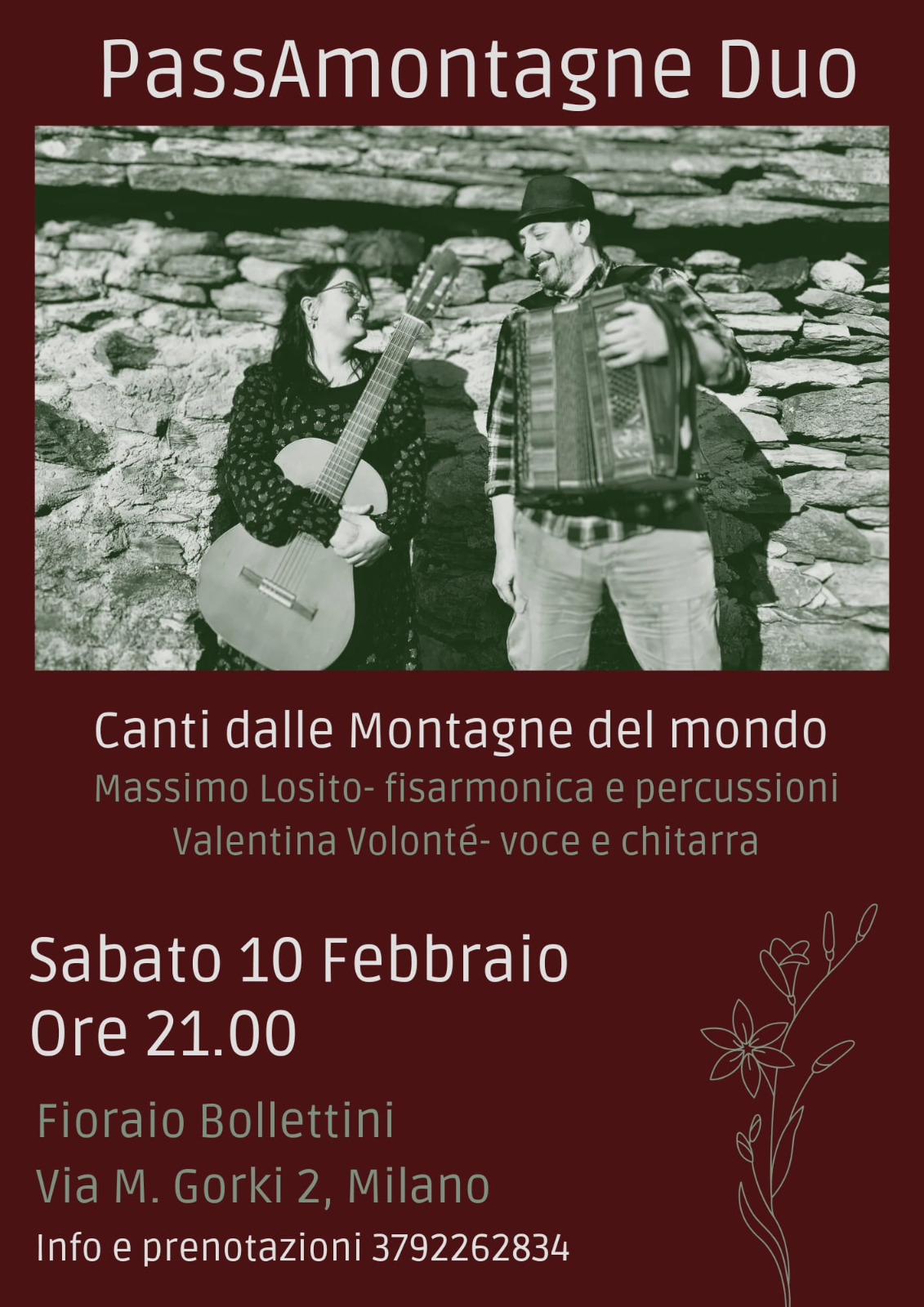 il Fioraio Bollettini vi invita nella sua bottega per il concerto di PassAmontagne, Duo che si dedica al contrabbando di suoni, ritmi, melodie e parole al confine fra lingue e culture diverse.. Ci racconteranno di una montagna che ignora le frontiere e diventa punto di contatto tra le persone grazie ai canti della tradizione orale, dalle Alpi ai Pirenei, dalle Ande agli Appennini. Il concerto è ad offerta libera a cappello per i musicisti (minimo consigliato 10€). Per partecipare è necessaria la prenotazione poiché i posti sono limitati. Vi aspettiamo tra Fiori e Musica!